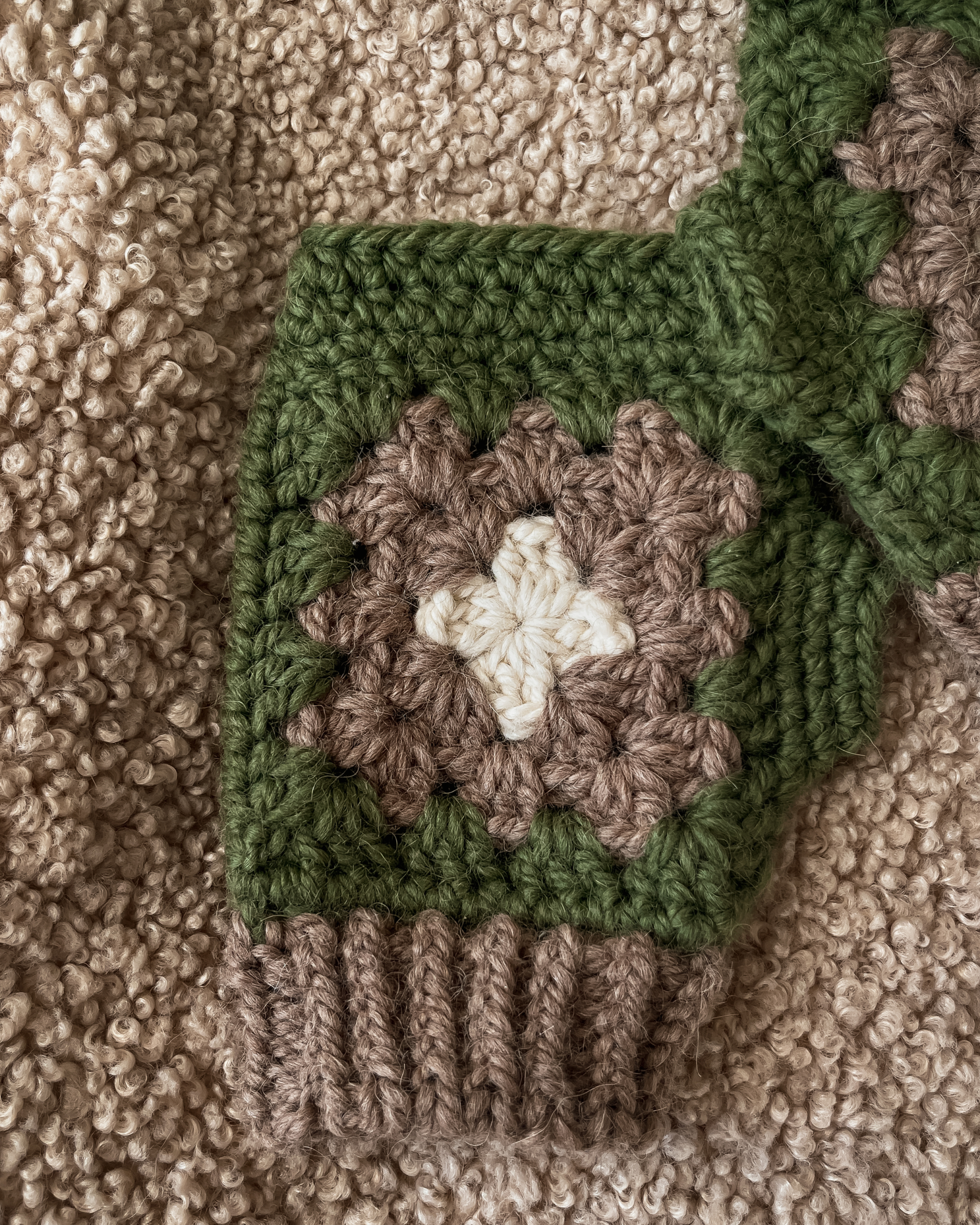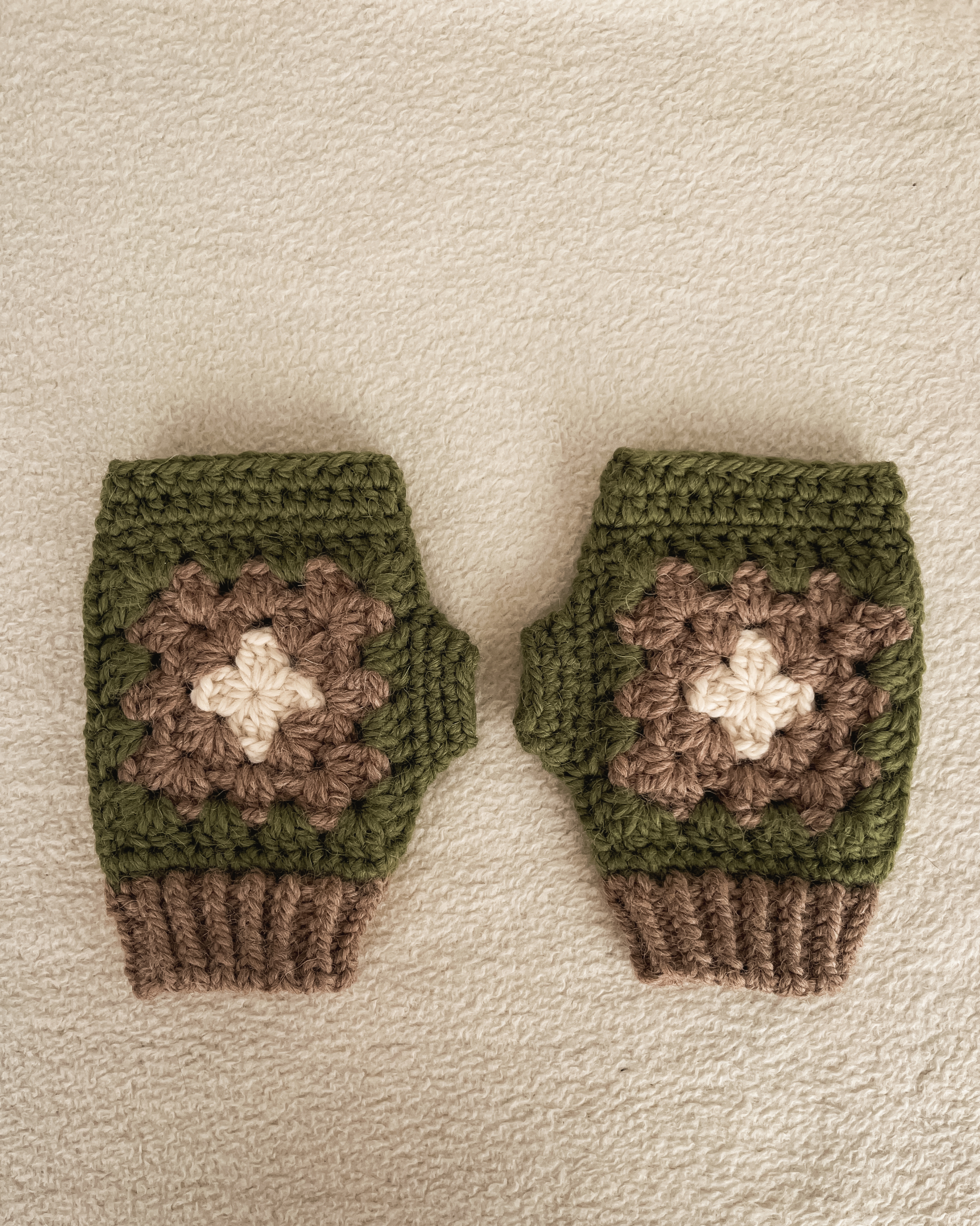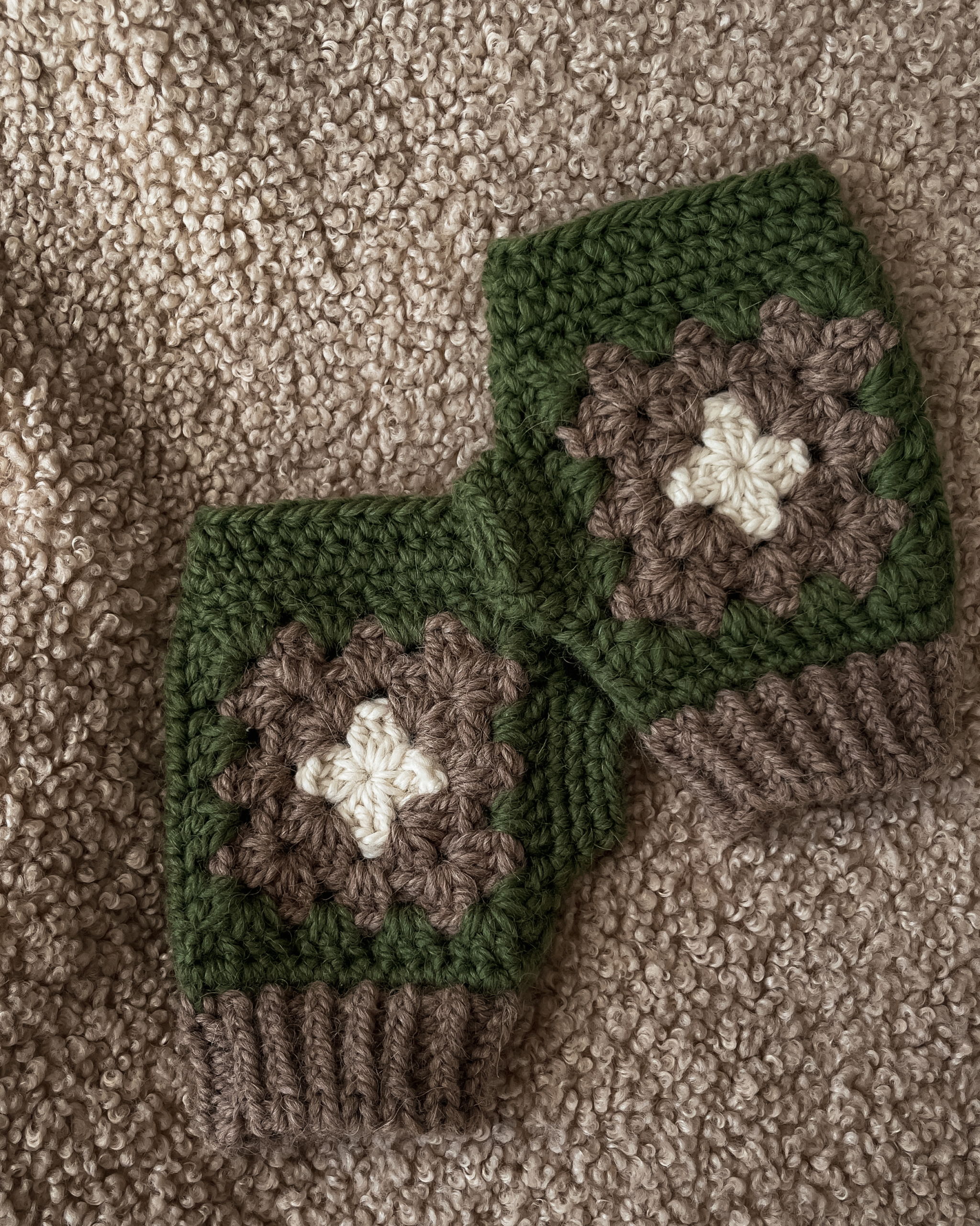 Chunky handwarmers with a comfortable thumb opening—warmth you can actually move in. Moss green with taupe and cream brings a grounded palette with just enough contrast to feel intentional.