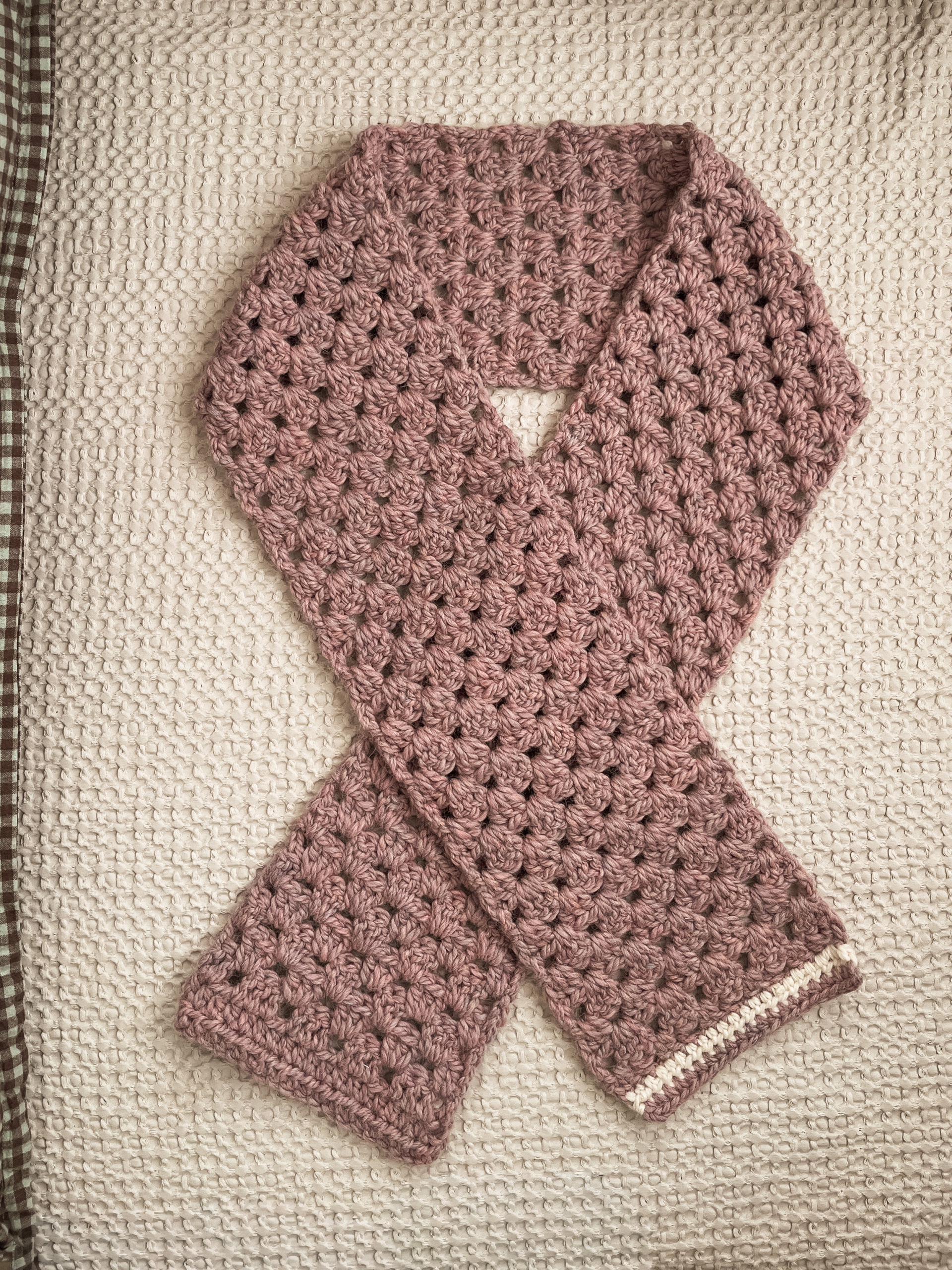 A long, slim scarf with an easy drape—warm enough to matter, slim enough to style without bulk. Dusty pink with a cream detail keeps it soft, not sweet, with a clean contrast that feels considered.